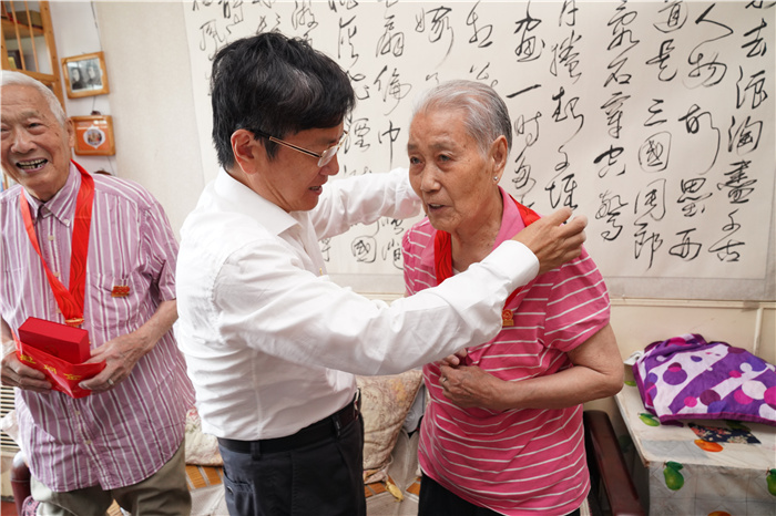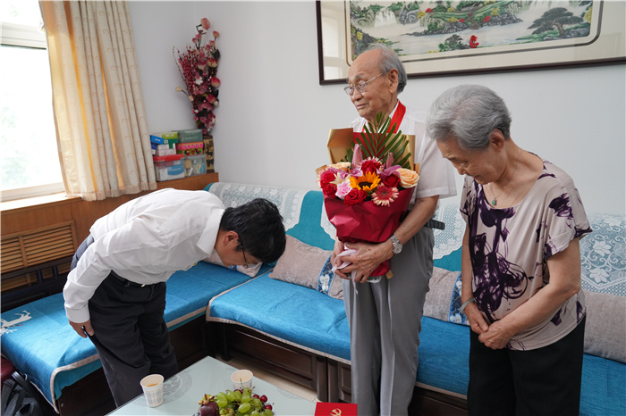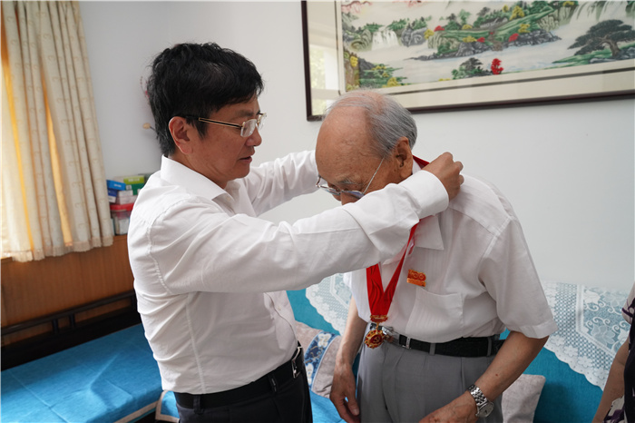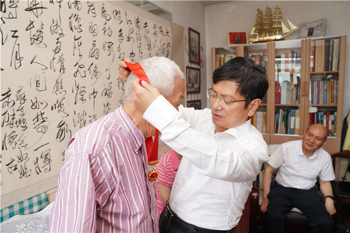 6月25日中午,校党委书记郑强在党委办公室、组织部、离退休党委等相关部门(单位)负责人的陪同下,先后来到93岁高龄、有着75年党龄的老党员王巨寿和连续三年缴纳特殊党费的老党员邓计芳家中,为他们郑重送上“光荣在党50年”纪念章。