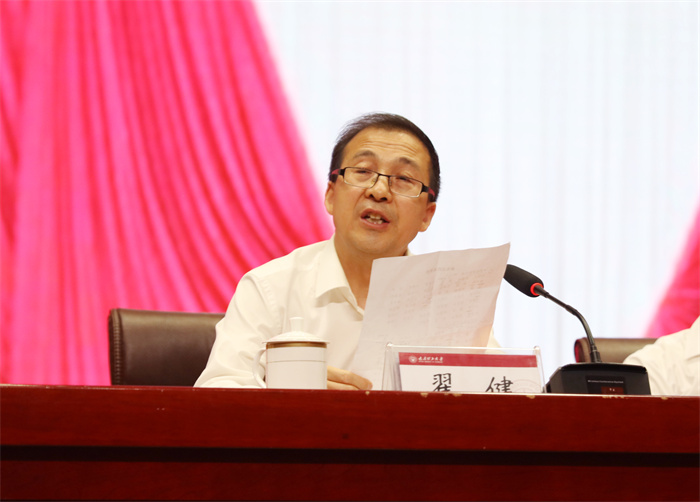 “我志愿加入中国共产党……”伴随着雄壮的《国际歌》,校党委书记郑强带领校领导班子全体成员,与来自全校的100名新党员代表一道,面向鲜红党旗庄严宣誓。同时,与会的老党员重温了入党誓词。校党委常委、纪委书记翟健宣读了参加宣誓的新党员代表名单。